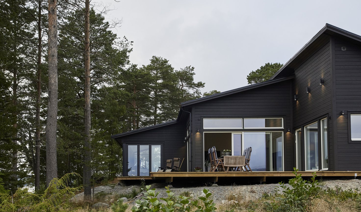 Inte långt från världsarvet Höga Kusten, längst ute på en liten udde, smälter Karin och Jan Näslunds nybyggda villa in fint i skärgårdsmiljön strax utanför Domsjö i Örnsköldsvik. Genom närheten till både naturen med sälar och ett rikt fågelliv och sina arbeten i stan tycker paret att de får det bästa av två världar.